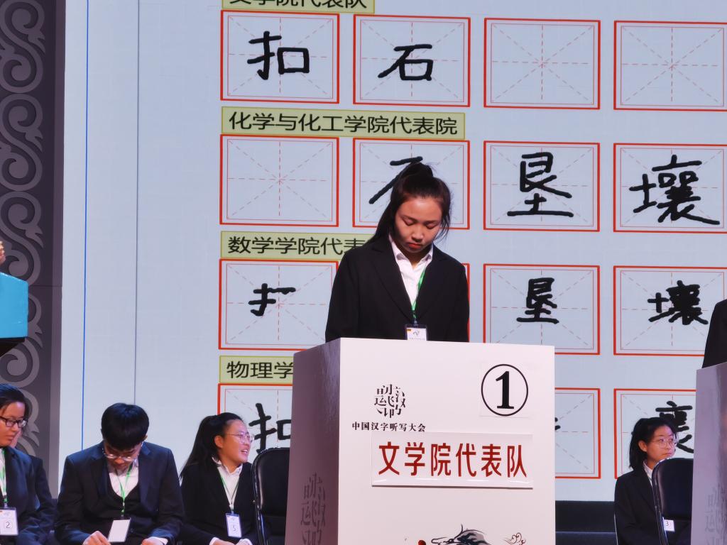 比赛竞争激烈,选手们在听到主考官的指令后,仔细思考,认真书写。台下观众也积极参与其中。经过复赛、决赛的精彩角逐,教育科学学院代表队获得第一名,文学院代表队获得第二名,政治与历史文化学院获得第三名。