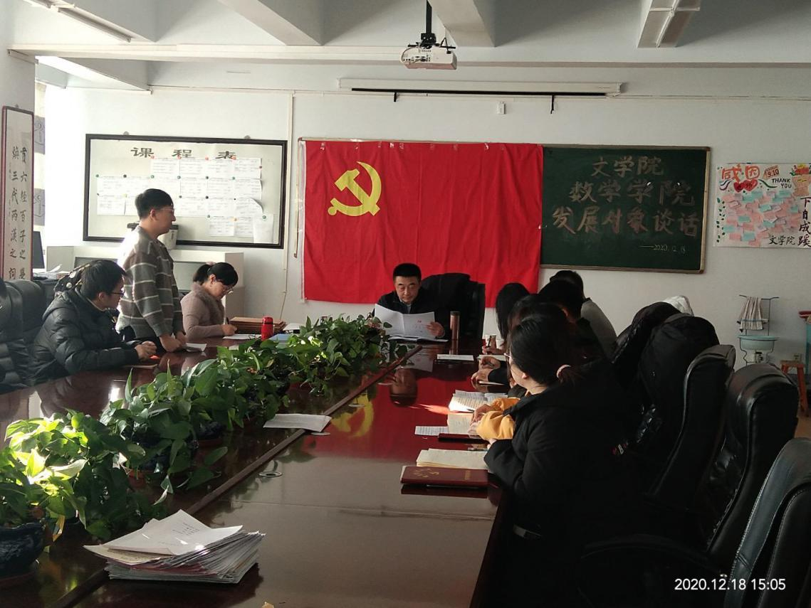 12月18日,按照中共党员发展程序,beat365在线唯一官网党委副书记刘春与文学院、数学学院新发展党员进行集体谈话。数学学院学工支部书记王秀琴主持会议。文学院学工支部书记孙俊秀和9名新发展党员参加了集体谈话。