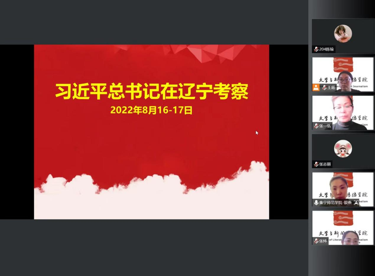 文学与新闻传播学院教工党支部书记张炜领学习近平在省部级干部会议上的讲话,学生党员赵阳阳领学习近平在党外人士座谈会上的讲话,文学与新闻传播学院学工党支部书记银燕领学习近平在新疆考察时的讲话,教师党员张志丽领学习近平在辽宁考察时的讲话。