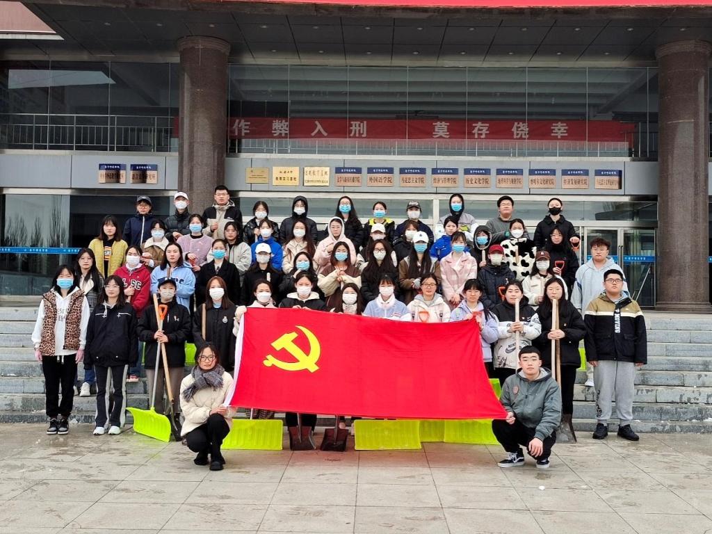 近段时间连续多天的雨雪天气导致道路积雪冰冻严重,为了给师生创建安全、舒适的出行环境,4月5日,文学与新闻传播学院开展“砥砺奋进守初心,青春献礼二十大”主题党日活动。我院全体学生党员及入党积极分子参加了图书馆对面主干道区域的扫雪工作。