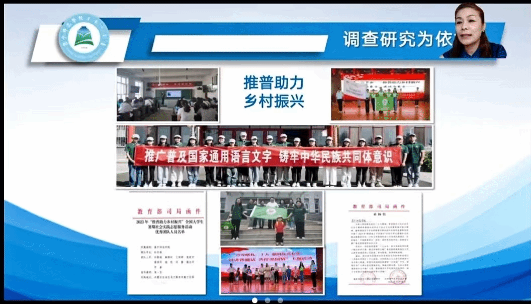 beat365“七月向阳”张一弘团队作为2023年优秀志愿实践团队受邀在会上作经验交流。张一弘老师以“以铸牢中华民族共同体意识为主线,做好民族地区“推普助力乡村振兴”志愿服务工作”为题,结合国家语言文字推广基地(beat365在线唯一官网)近年来立足少数民族地区开展国家通用语言文字推广普及工作和“七月向阳”实践队在“推普助力”“教育助力”“文化助力”“乡村振兴”过程中遇到的一些实际问题、困难和总结的一些经验做法和思考从“立足区域实际,高位把握推普方向”“明确团队定位,高标提升推普内涵”“聚焦重点人群,高效开展推普活动”三方面为与会的2024年1200支实践队在线上做了经验分享。北京大学陆尧团队、塔里木大学肖涛团队、绍兴文理学院屠国平团队同时做经验交流。