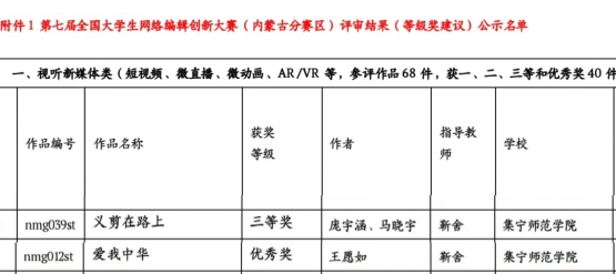 近日,由中国编辑学会主办、电子网络编辑专业委员会联合相关高校院系及多家单位共同举办的第七届(2024)全国大学生网络编辑创新大赛获奖名单公布。文学与新闻传播学院22级新闻学一班庞宇涵,马晓宇创作的《义剪在路上》获得视听新媒体类三等奖;22级新闻学一班王愿如创作的《爱我中华》获得视听新媒体类优秀奖。