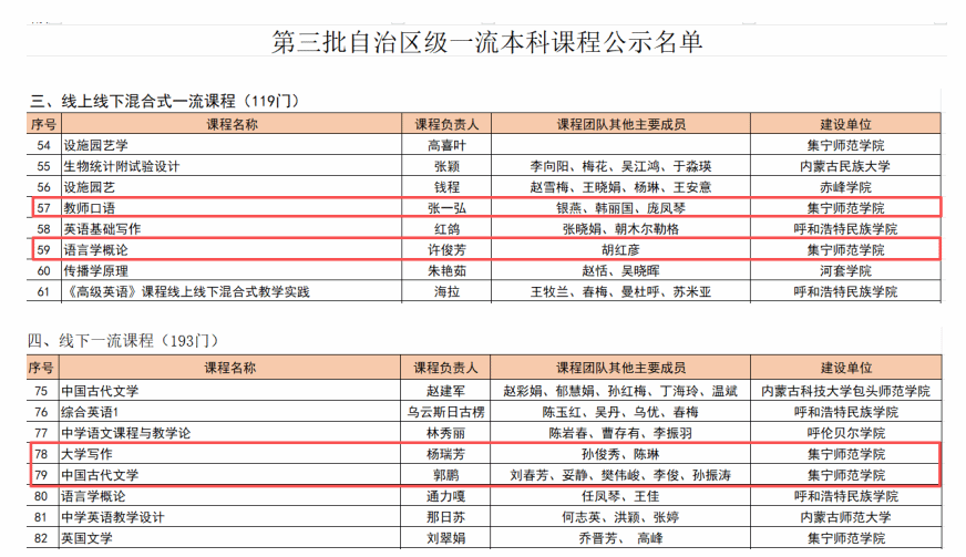 近日,内蒙古自治区教育厅发布《关于第三批自治区级一流本科课程认定结果的公示》,文学与新闻传播学院4门课程成功获批第三批自治区级一流本科课程,分别是张一弘团队的教师口语、郭鹏团队的中国古代文学、杨瑞芳团队的大学写作和许俊芳团队的语言学概论。