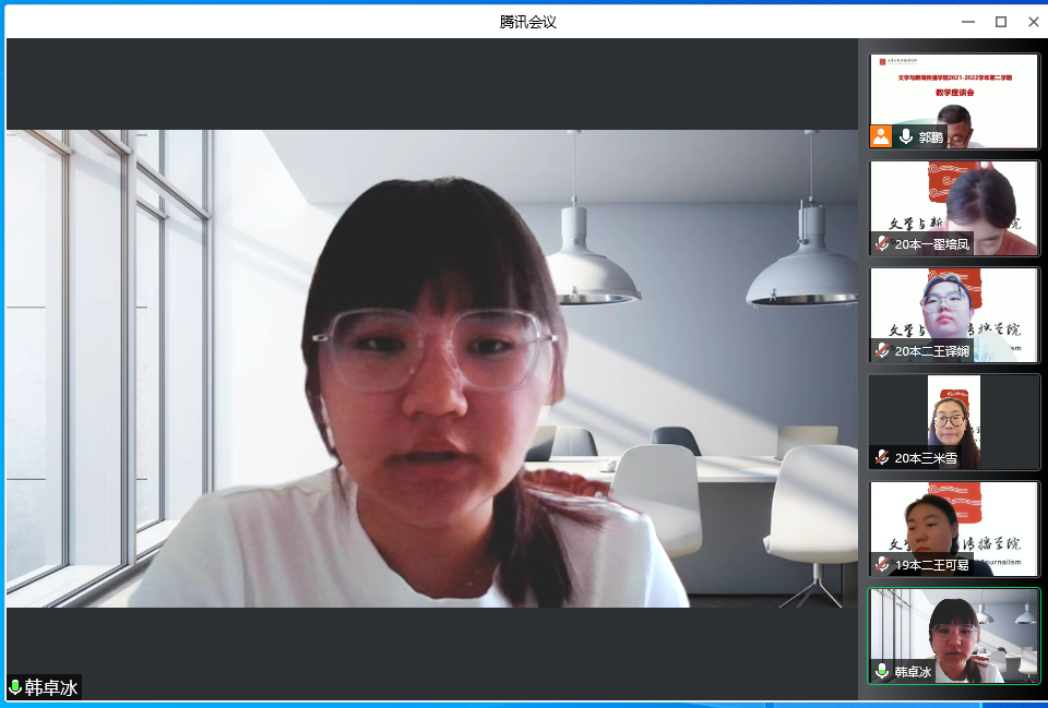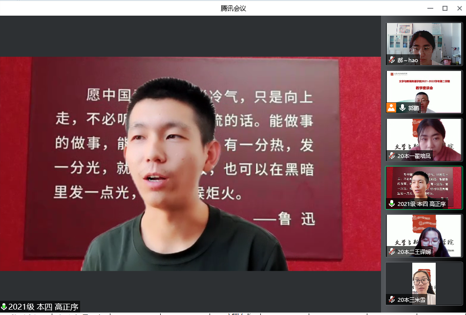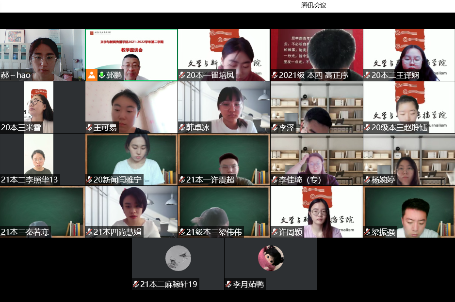 为了进一步做好本学期教学质量监控与评价工作,全面了解我院教学质量及运行现状,切实解决同学们学习中遇到的实际问题,6月23日上午,文学与新闻传播学院采取线上会议的方式召开了2021-2022学年第二学期教学座谈会。会议由教学科郝晓宏老师主持,副院长郭鹏及22名学生代表参加了本次座谈会。