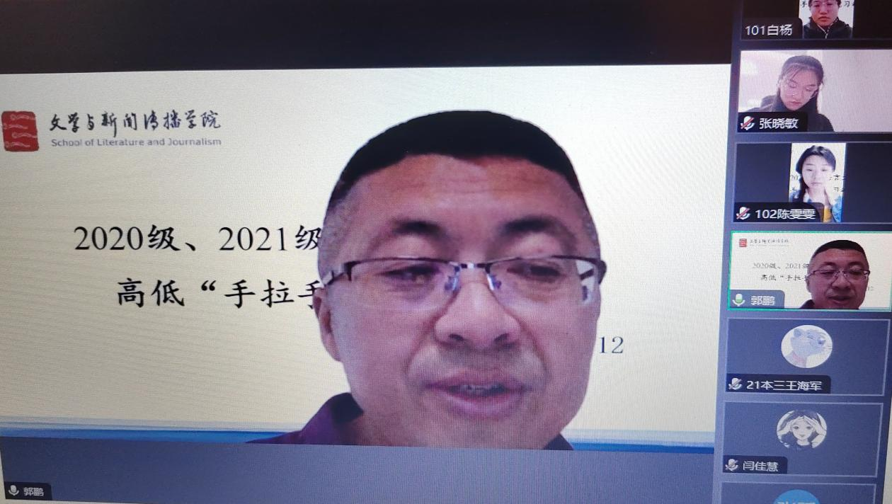 2024512日,文学与新闻传播学院利用“腾讯会议”召开汉语言文学专业高低“手拉手”习动员会。文学与新闻传播学院院长郭鹏20202021级汉语言文学专业学生参加会议,会议由汉语言文学系主任刘春芳主持。