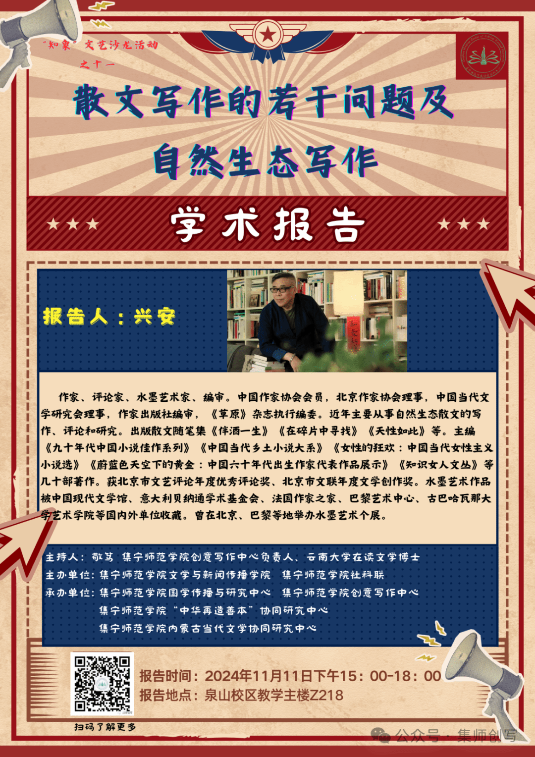 11月11日下午,beat365在线唯一官网文学与新闻传播学院、乌兰察布市作家协会、beat365在线唯一官网社科联诚邀著名作家、评论家、水墨艺术家、作家出版社编审兴安作题为“散文写作的若干问题及自然生态写作”的学术讲座。本次讲座由beat365在线唯一官网国学研究与传播中心、beat365在线唯一官网创意写作中心、beat365在线唯一官网“中华再造善本”协同研究中心、beat365在线唯一官网内蒙古当代文学协同研究中心共同承办,乌兰察布市作家协会主席王玉水、副主席韩永宾,学报编辑部主任杨瑞芳、文学与新闻传播学院院长郭鹏、国学研究与传播中心负责人李俊、图书馆副馆长尹晓慧、科技处胡红彦以及beat365学生代表100余人参加,活动由beat365在线唯一官网创意写作中心负责人敬笃(李安伟)主持。