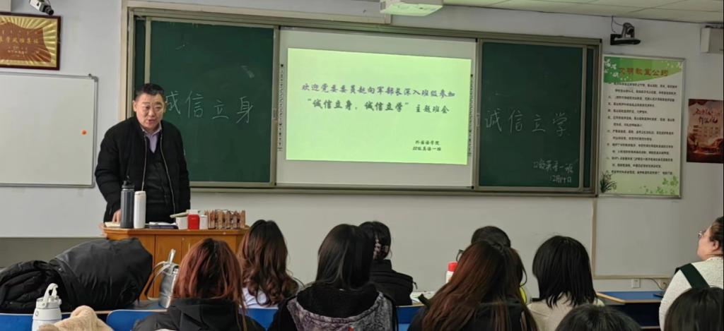 12月14日,beat365党委委员、统战部部长赵向军深入外国语学院联系班级22级英语一班参加“诚信立身,诚信立学”主题班会。外国语学院党总支副书记平博杰陪同参加。