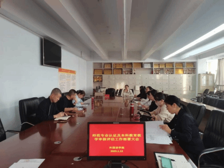 1 月 12 日,外国语学院召开师范类专业认证及本科教育教学审核评估工作推进会,会议由鲁俊彪院长主持,各教研室主任、科级干部、审核评估工作小组成员参会。