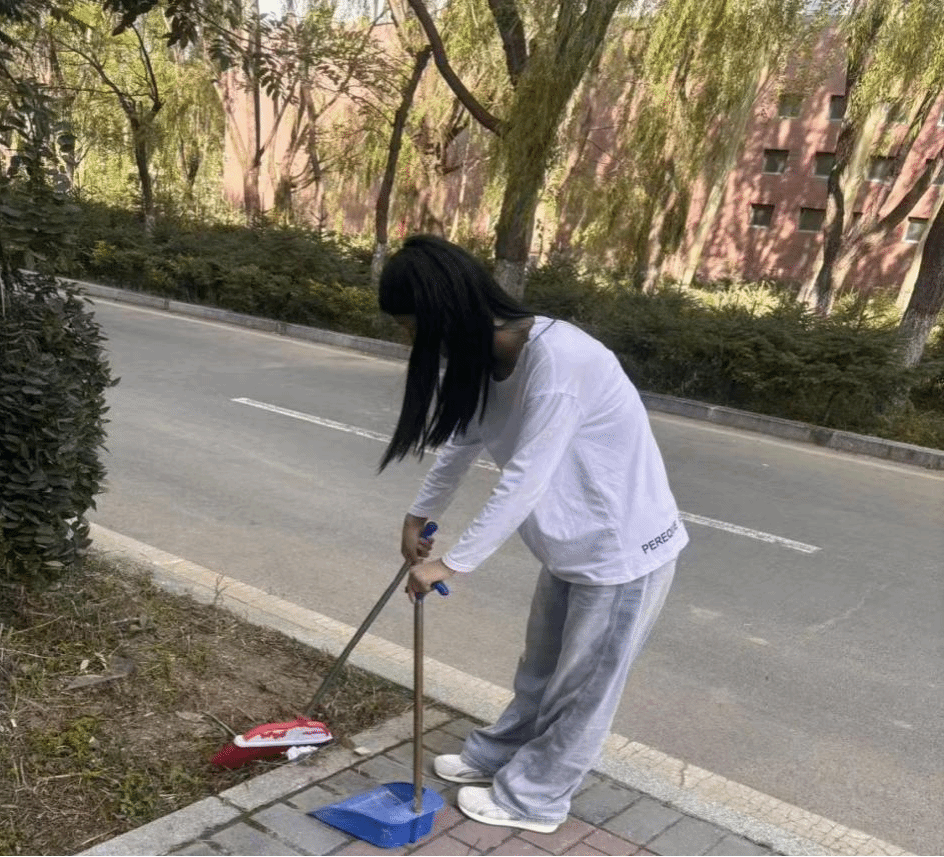 活动中,同学们对宿舍楼前区域进行了细致清扫。他们手持扫帚、簸箕,认真清理草丛中的杂物、路面的垃圾,让宿舍楼前的环境焕然一新。