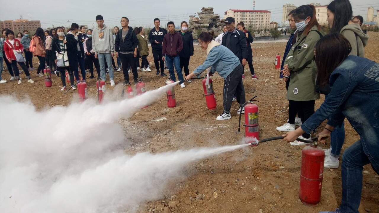 接下来白老师对干粉灭火器的构成、使用方法进行讲解,并指导三名学生使用废纸进行点火。并让其他学生使用干粉灭火器对现场小型模拟火点进行灭火,亲身感受在火场应该如何使用正确消防设备。