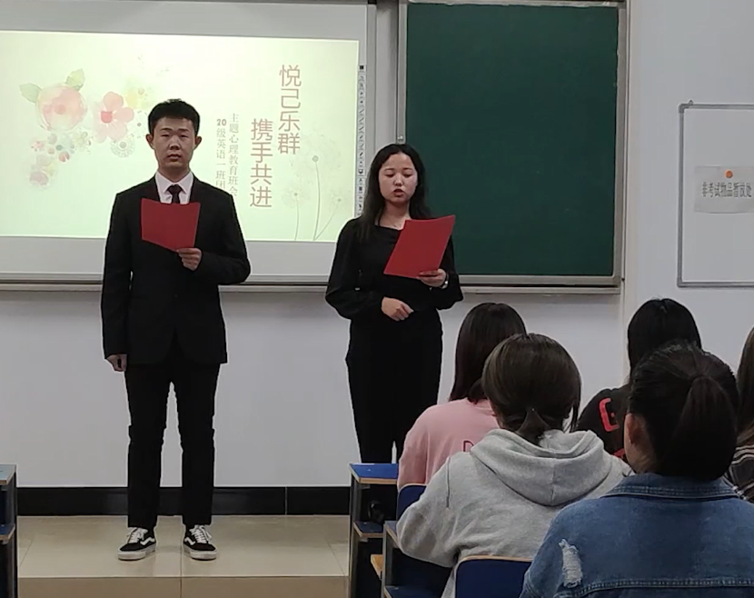 为进一步加强和改进大学生心理健康教育,增强大学生心理健康意识,提高大学生心理健康水平,外国语学院各班于5月15日至5月28日陆续开展了“悦己乐群.携手共进”主题班会。通过主题班会的开展,旨在逐步增强大学生心理适应能力和问题应对能力,号召大学生关注心理健康,培育理性平和的健康心态,珍惜韶华,脚踏实地,为实现“两个一百年”奋斗目标和中华民族伟大复兴中国梦做出贡献。