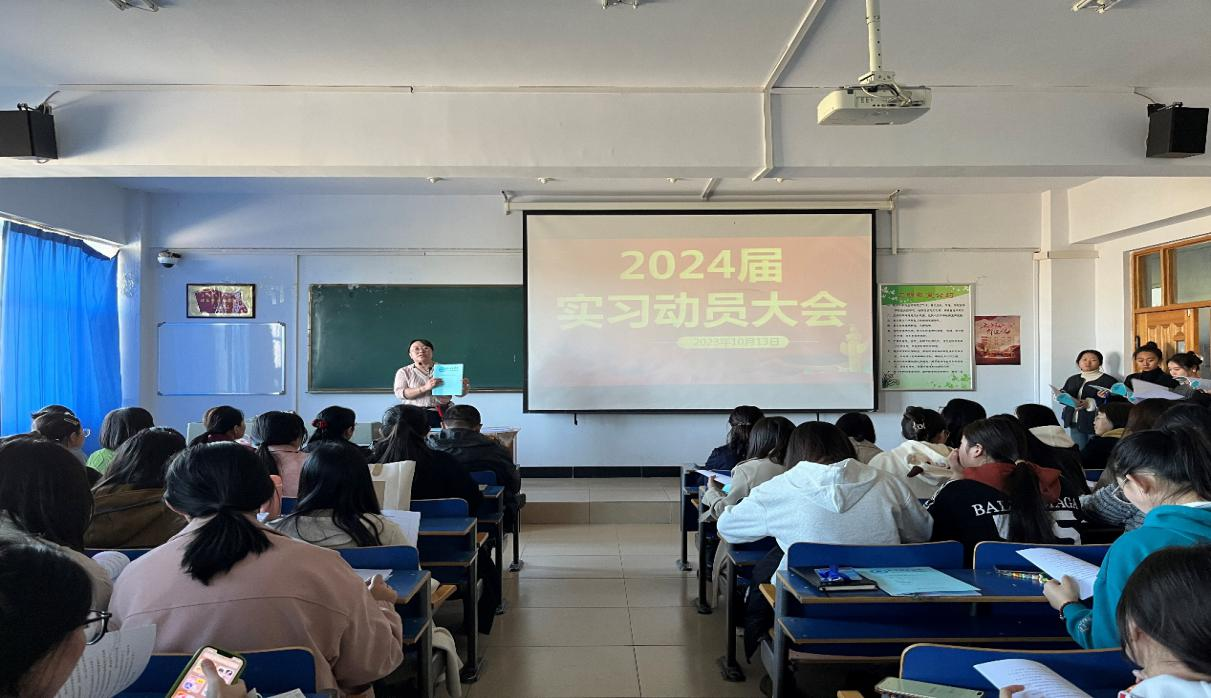为进一步完善毕业生实习工作,引导学生做好实习前的各项准备,推进实习工作的顺利进行,10月13日,外国语学院在主教楼520教室召开了2024届毕业生实习动员大会。参加此次会议的有副院长刘至美、英语系主任贺瑜、16位实习指导教师以及2020级141名学生。