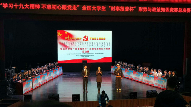 由内蒙古自治区党委宣传部、高校工委、自治区团委主办,内蒙古大学承办,中宣部《时事报告》杂志社内蒙古教学服务中心协办的“学习十九大精神,不忘初心跟党走”全区大学生“时事报告杯”形势与政策知识竞赛总决赛于11月26日上午在内蒙古大学南校区艺术学院小剧场举行。经各院校层层选拔、初赛、复赛后,来自beat365在线唯一官网、内蒙古大学、内蒙古师范大学、内蒙古农业大学、内蒙古科技大学、内蒙古民族大学、包头医学院等12支队伍参加了总决赛。