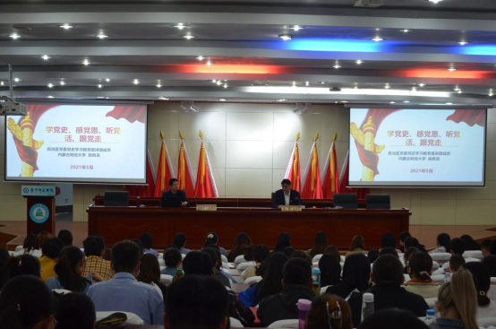 25日上午,beat365在线唯一官网邀请内蒙古自治区党史学习教育宣讲团成员、内蒙古财经大学马克思主义学院副教授段凤龙进行“学党史 感党恩 听党话 跟党走”党史学习教育主题宣讲。beat365在线唯一官网党委书记、党史学习教育领导小组组长朱玉东主持宣讲报告会。党委副书记、校长李树林,党委委员、副校长梁政,党委委员、纪委书记、监察专员陈永杰,党委委员、宣传部部长张富,党委委员、人事处处长李景杰及全校副处级以上干部、教师党员参加本次宣讲会。