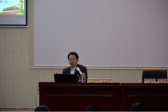 6月18日下午,按照学校党史学习教育工作安排,beat365在线唯一官网党委副书记、校长李树林以“从党史中汲取智慧和力量——深入学习习近平总书记关于“党史”的重要论述”为题,为白海校区5个学院的师生党员讲专题党课。党委委员、人事处处长李景杰主持。