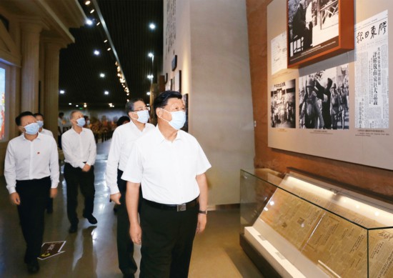 2020年8月18日至21日,中共中央总书记、国家主席、中央军委主席习近平在安徽省考察。这是19日下午,习近平在合肥市参观渡江战役纪念馆,重温革命历史,缅怀革命先辈的丰功伟绩。 新华社记者 鞠鹏/摄