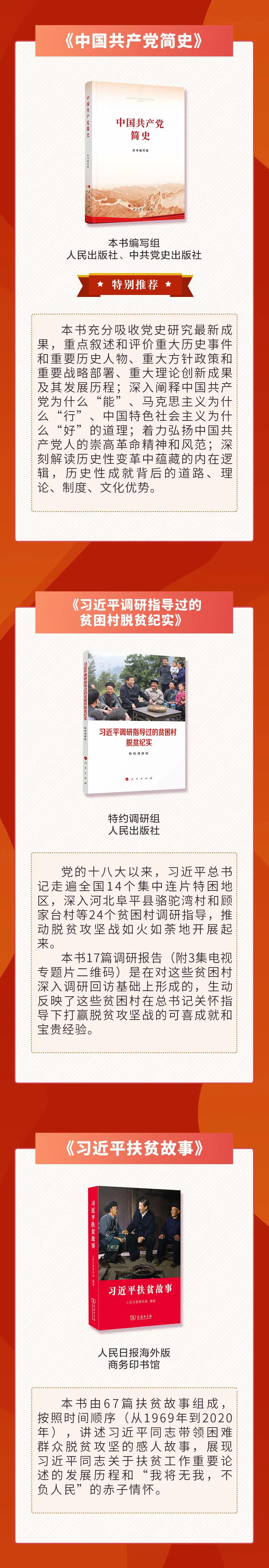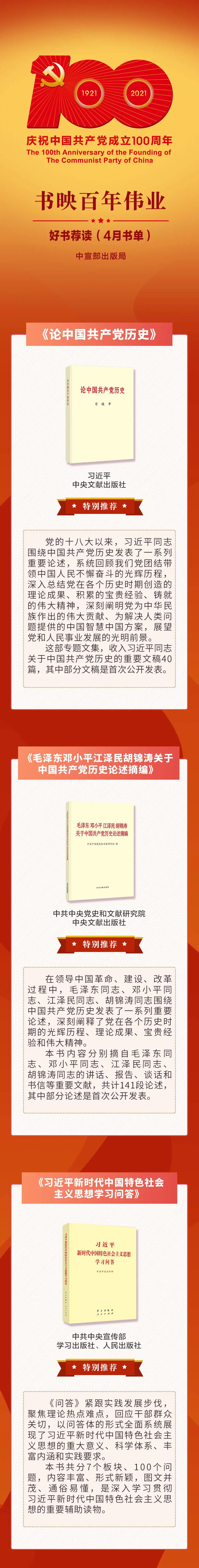 为庆祝中国共产党成立100周年,中共中央宣传部出版局联合有关单位和部门开展“书映百年伟业——庆祝中国共产党成立100周年好书荐读”活动,于2021年4月—12月,每月向全社会公布当月推荐书单。4月书单,一起来看↓↓↓