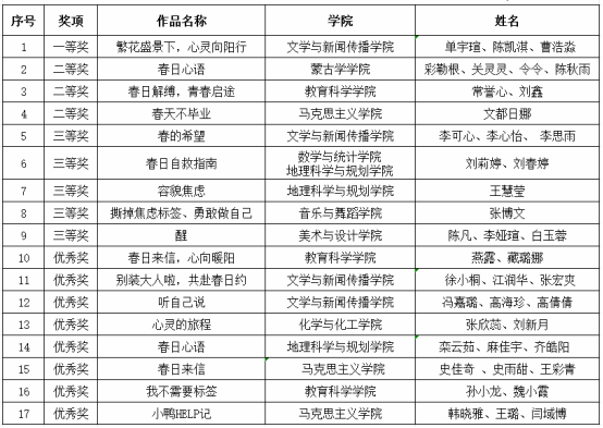 此次 “春日心语” 心理健康微视频征集活动的成功举办,不仅为同学们提供了一个展示才华的平台,更让心理健康意识深入校园的每一个角落。通过这些优秀作品,同学们用独特的视角和真挚的情感传递了积极向上的生活态度,为春日的校园注入了一股温暖而强大的心灵力量。未来,我们将继续举办各类心理健康活动,为同学们的身心健康保驾护航,共同营造一个充满爱与关怀的校园环境 。