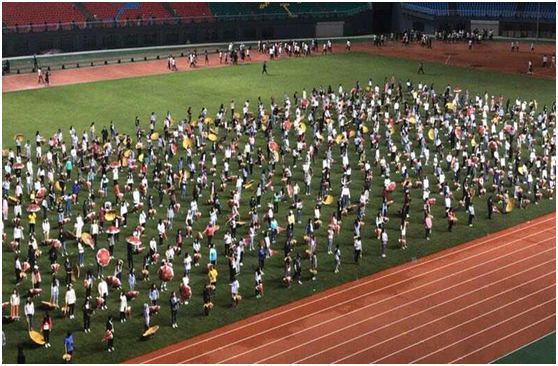 7月27日,大型文艺表演排练在beat365泉山校区田径运动场正式拉开帷幕。在学生工作部的组织协调和领队老师的认真管理下,近800名参演学生选择了暑假留校,顶着酷暑,在高温下紧张地排练着,从早练到晚练,皮肤从白练成黑,中暑、皮肤晒伤无法避免。广大师生始终在坚持,风雨无阻地排练了20余天,用汗水和辛苦练就了每一个标准动作,磨砺出顽强意志,共同用精彩的表演为“十四运”增光添彩。