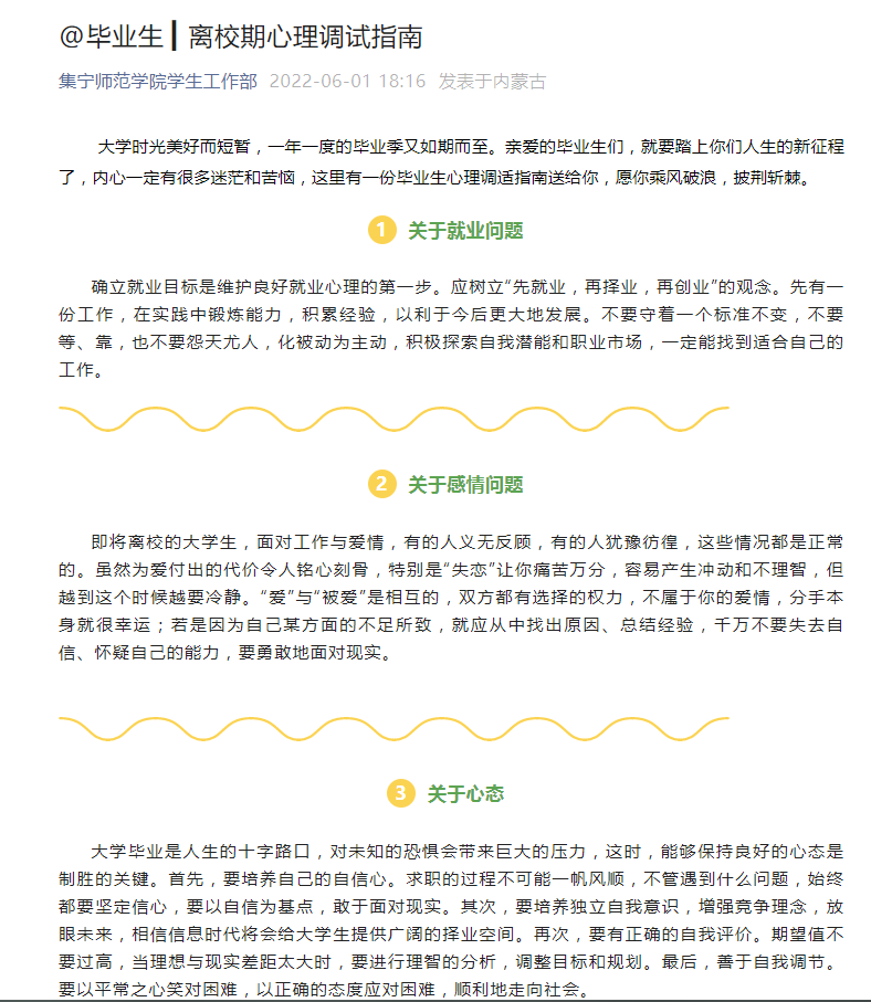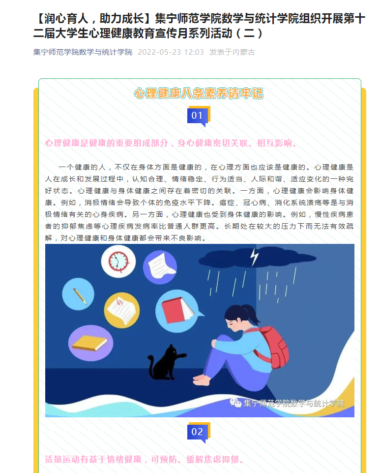 学校心理健康教育中心和各二级学院分别通过网站、微信号等线上平台,面向全体学生推送心理健康相关内容,广泛传播心理健康科学知识。对特殊群体,如毕业生、风险地区学生、有心理疾病学生等,发布专业的心理自助知识。通过大面积、多渠道、覆盖式的心理健康知识宣传,普遍提高了同学们的心理健康意识,增加了对心理健康保健的知识和技能的了解。