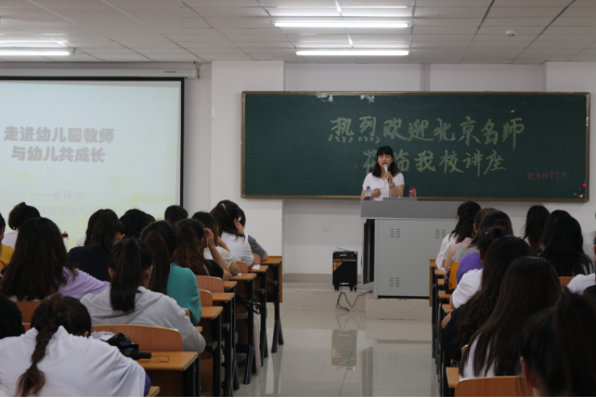 本次培训特聘的另一位专家是北京市向日葵逸翠幼儿园园长崔凤华。在“幼儿园一日生活细则及半日活动组织”的讲座中,崔园长以游戏为导入方式,分析了幼儿园一日生活中四大活动的概念、要求、活动细则,以及半日活动如何有效的组织,最后还分享了师幼互动的一些小游戏给同学们。在“走进幼儿园教师,与幼儿共成长”的讲座中,恰当地定位了幼儿园教师的角色,对幼儿园教师的工作特点,工作要求和工作内容作了详细讲解,为即将走上教师岗位的同学们建立了更全面的职业认知。