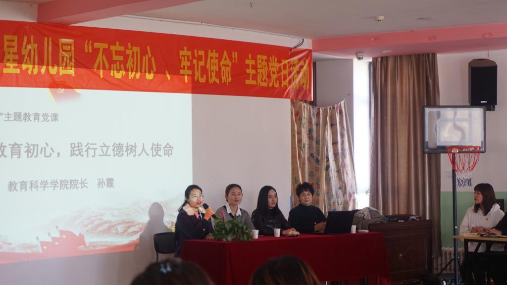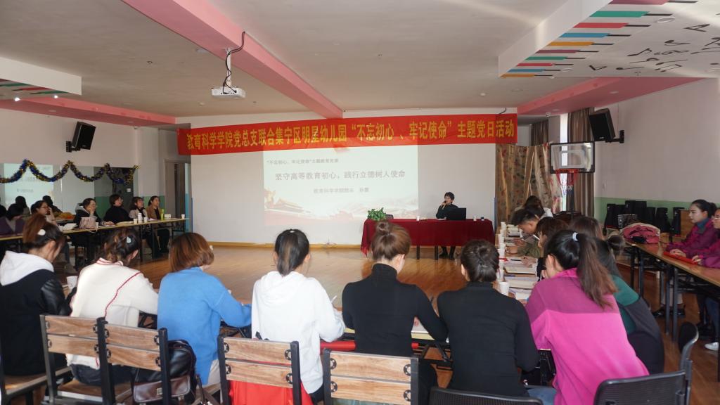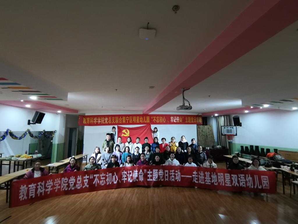 为继续深入推进“不忘初心、牢记使命”主题教育活动,11月14日下午,beat365在线唯一官网教育科学学院党总支组织全体师生党员走进实习基地——集宁区明星双语幼儿园联合开展主题党日活动。本次活动由教育科学院党总支书记张妙珠、院长孙霞带队,beat365在线唯一官网“不忘初心、牢记使命”领导工作小组第四小组成员王秀琴参加了本次活动。活动由走进基地看望实习生一次、走进实习生课堂一次、上主题党课一次、开展党员志愿服务一次、送学上门一次以及开门纳谏等环节组成。