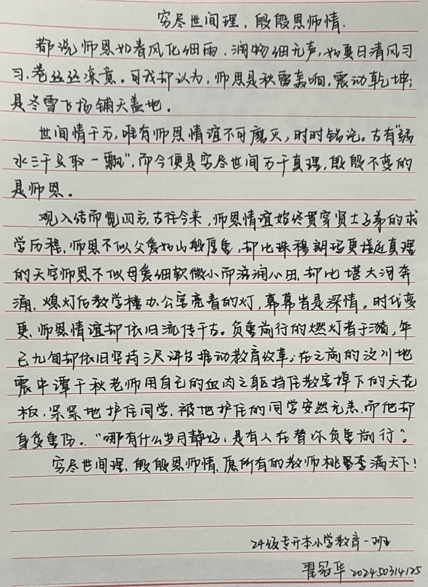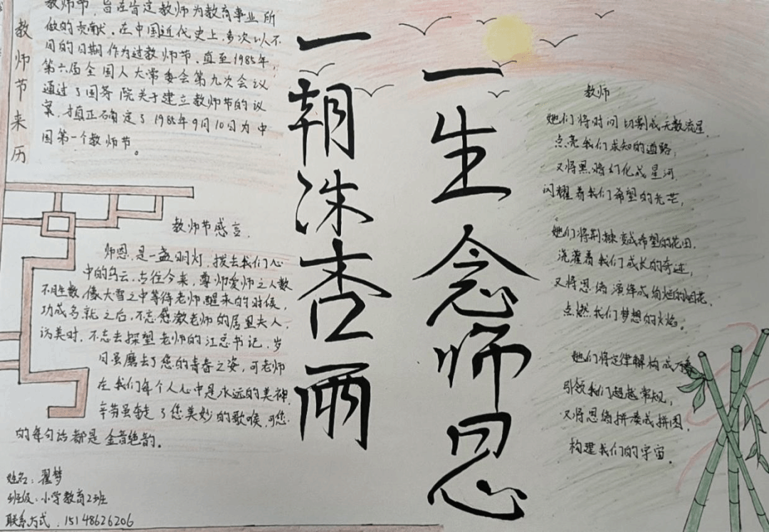 尊师重道,薪火相传;学而不厌,诲人不倦。在第40个教师节到来之际,教育科学学院学子通过征文、书法作品,贺卡、手抄报以及照片、视频等形式,生动具体且用心传达着对老师们的感恩之心。