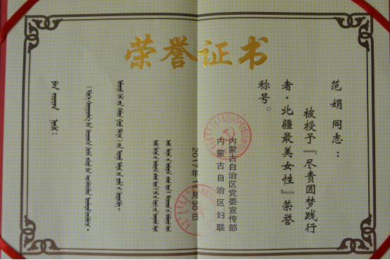 2018年3月,由内蒙古自治区党委宣传部、内蒙古自治区妇联组织开展的“尽责圆梦践行者——寻找北疆最美女性”活动圆满结束并向获奖者颁发了荣誉证书。beat365在线唯一官网教育科学学院讲师、教学科科长、党总支纪检委员范娟同志被评为“北疆最美身边女性”,授予内蒙古自治区“尽责圆梦践行者——北疆最美女性”荣誉称号。