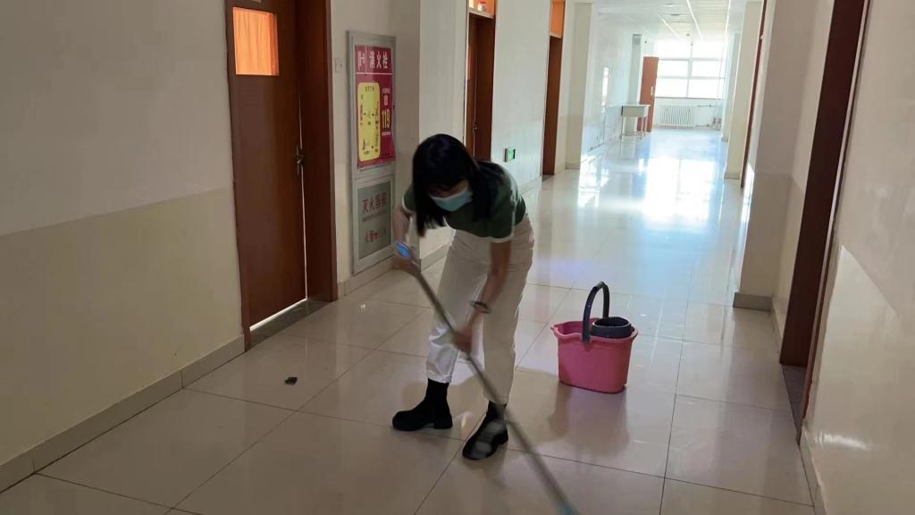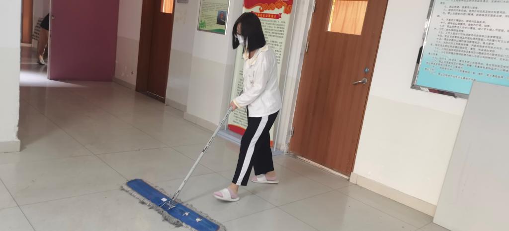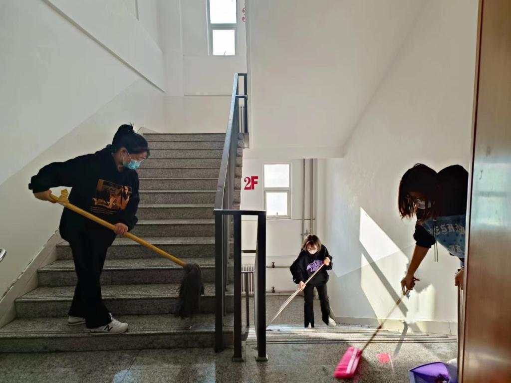 老师和同学们礼貌敲门动员各宿舍学生一起投入清扫活动中,同时宣传疫情期间佩戴口罩、及时清理垃圾、保持清洁环境的必要性。在师生志愿者的带领下,同学们井然有序、积极开展了卫生清扫工作。