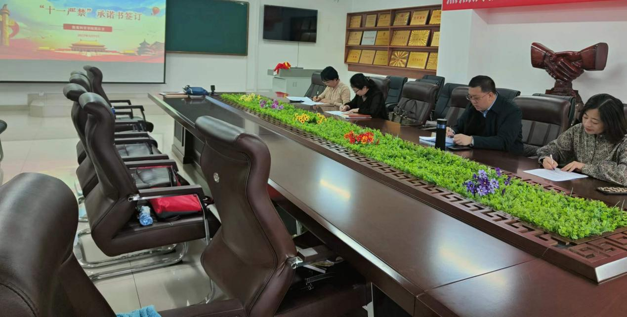 党总支书记张妙珠带领学院党员干部们认真学习了解了党内政治生活庸俗化交易化问题“十一严禁”承诺书的具体内容,要求大家严格按照承诺书的要求做到“十一严禁”。党员干部们严肃认真地一一签订了承诺书并纷纷表示一定严格要求自己,不断提高政治素质与纪律意识。