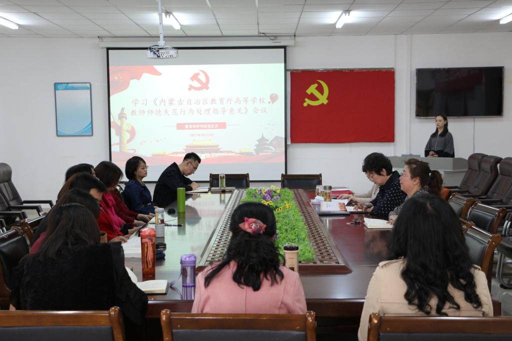 根据校党委、校纪委的安排部署,教育科学学院党总支于4月14日下午在230会议室组织全体教师召开学习《内蒙古自治区教育厅高等学校教师师德失范行为处理指导意见》会议。