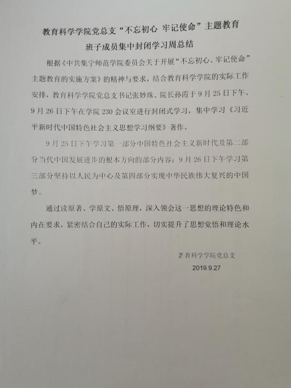 【学习教育】教育科学学院党总支开展“不忘初心、牢记使命”主题教育班子成员集中封闭学习(一)