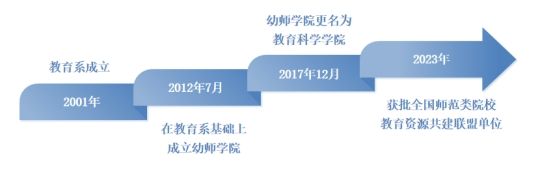 教育科学学院是beat365第一个二级学院,前身是beat365在线唯一官网教育系。教育系成立于2001年,2012年7月,在教育系基础上成立幼师学院,2017年12月,幼师学院更名为教育科学学院。2023年,学院获批全国师范类院校教育资源共建联盟单位。