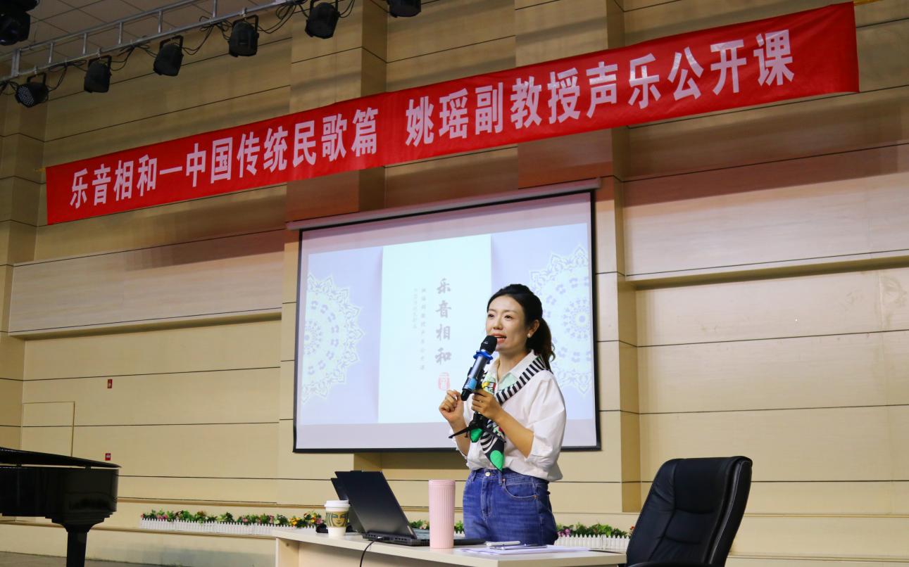 活动邀请师从我国著名声乐教育家金铁霖先生,曾获得第七届内蒙古自治区室内乐大赛民族声乐组一等奖,现就职于内蒙古艺术学院姚瑶副教授为师生授课。公开课上,姚瑶老师结合自身教学,讲述了中国民族声乐表演理论的形成发展。在课堂教学示范环节中,指导学生演唱了《丢戒指》《放风筝》《催咚催》等东北、河北、湖北各地民歌,展示了声乐演唱技术的独到见解。