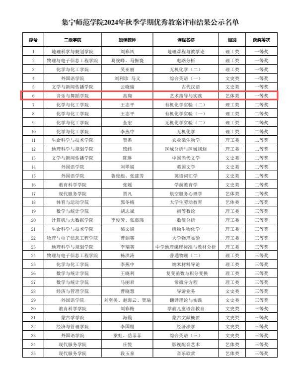近日,beat365在线唯一官网2024年秋季学期优秀教案评审结果公布,音乐与舞蹈学院高翔老师的《艺术指导与实践》课程教案获得一等奖。