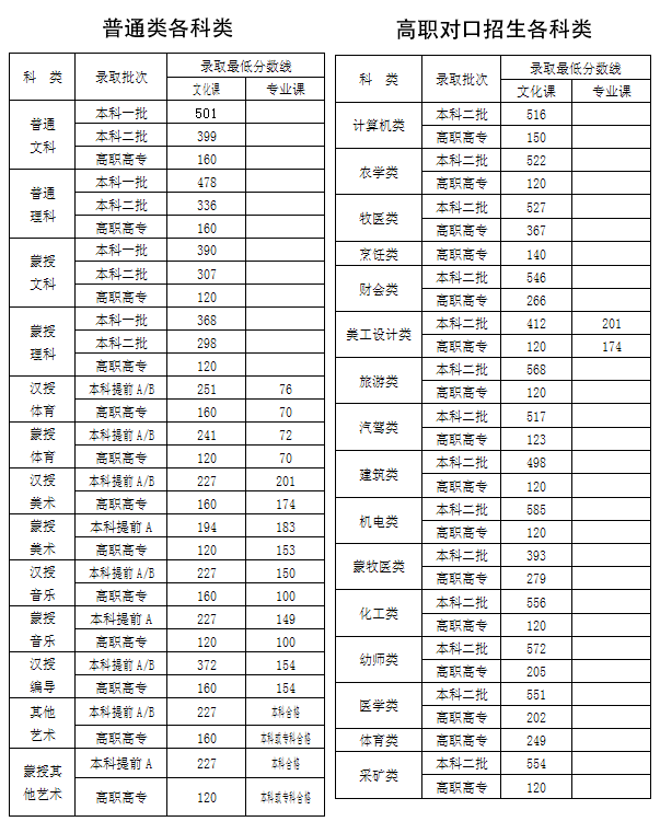 2018年内蒙古自治区普通高等学校招生录取最低控制分数线