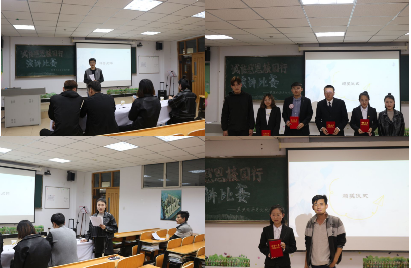 2018年4月12日晚,政史学院大学生“诚信感恩校园行”演讲比赛于主教楼420举行。学工办主任田博、学生会主席王冰莹、副主席张文强、办公室主任王婷、学习部长杨贵枝、就业规划部长王维学担任本次比赛评委。本次演讲比赛以“诚信感恩”为主题脱稿演讲,选手们从不同角度阐释了诚信感恩的宝贵品质。 演讲结束,田博老师对活动进行点评和总结。本次比赛共决出一等奖1名,二等奖2名,三等奖3名,由评委为本次演讲比赛的获奖选手进行颁奖。
