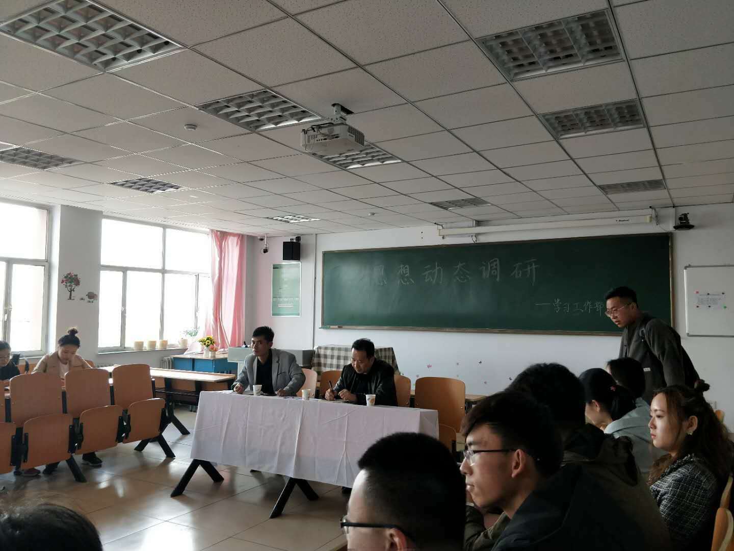本次座谈内容包括对十九大精神和习近平新时代中国特色社会主义思想的学习贯彻情况、对“两会”召开的反应和期待、对国际国内政治安全形势及时事新闻的关注情况、对从严治党及十八大以来反腐倡廉成效的反响、对理想信念、人生价值、择业就业的态度与看法、特殊群体学生的思想情况、学生信仰宗教状况、对学校教育、管理、服务等方面的意见建议等议题,各班代表总结班级调研情况进行发言。韩德杰和田博两位老师对学生提出的问题进行了现场解答,并就各项议题与同学们进行了深度交流,对同学们反映的情况进行了详细记录。