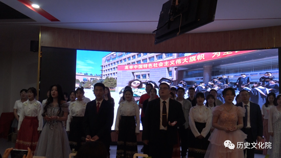 本次典礼在国歌声中拉开帷幕。出席本次典礼的有历史文化学院党总支书记赛汉其其格老师,历史文化学院党总支副书记、历史文化学院院长张军老师,历史文化学院副院长章国军老师,历史文化学院教研室主任大晶老师,历史文化学院学工办主任范丽敏老师,历史文化学院学工办副主任王贵连老师,历史文化学院教学科科长、毕业班班主任梁翠芳老师,以及历史文化学院何学慧老师、周瑞平老师、王英维老师、张彦霞老师、赵兴明老师。