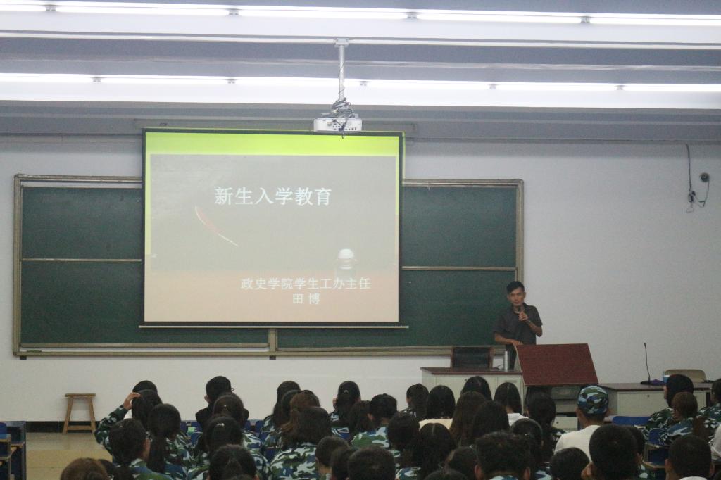2018年9月5日晚政法与历史文化学院于主教楼201教室举办新生入学教育专题讲座。本次讲座分别由政史学院院长杨福和和学工办主任田博担任主讲。政史学院2018级全体新生及班主任聆听了讲座。