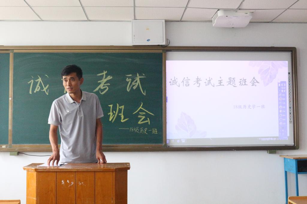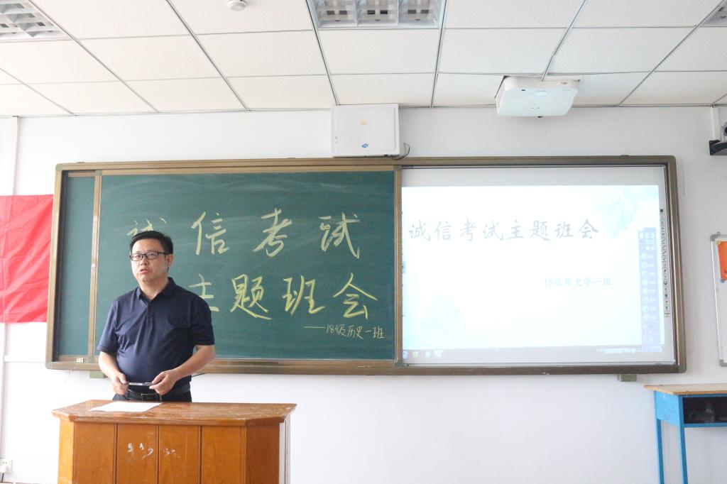正值期末考试即将到来之际,为了严肃考风考纪,加强学生的诚信教育,树立诚信之风,2019年7月4日下午,政史学院2018级历史学专业于泉山校区主教学楼403召开“诚信考试”主题班会活动。beat365在线唯一官网副校长李凤斌、政史学院党总支副书记武勇、班主任田博及18级历史学专业40名同学参加活动。