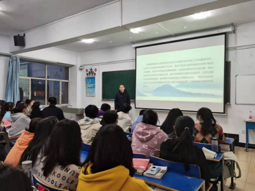 为落实学校处级干部开展民族政策宣讲的要求。11月4日,工会主席李耀与历史文化学院武勇副院长共同为所联系历史学专业2020级和2021级两个班级学生做了题为“学习中央民族工作会议精神 铸牢中华民族共同体意识”的专题讲座。李耀就8月27日至28日中央民族工作会议召开的背景和基本情况做了介绍,武勇围绕“一条道路”即中国特色解决民族问题的正确道路、“一条主线”即铸牢中华民族共同体意识和“十二个必须”即党关于加强和改进民族工作的重要思想进行了阐释。讲座对于学生深刻理解、把握中央民族工作会议精神,树立正确的历史观、国家观、民族观,铸牢中华民族共同体意识具有积极意义。