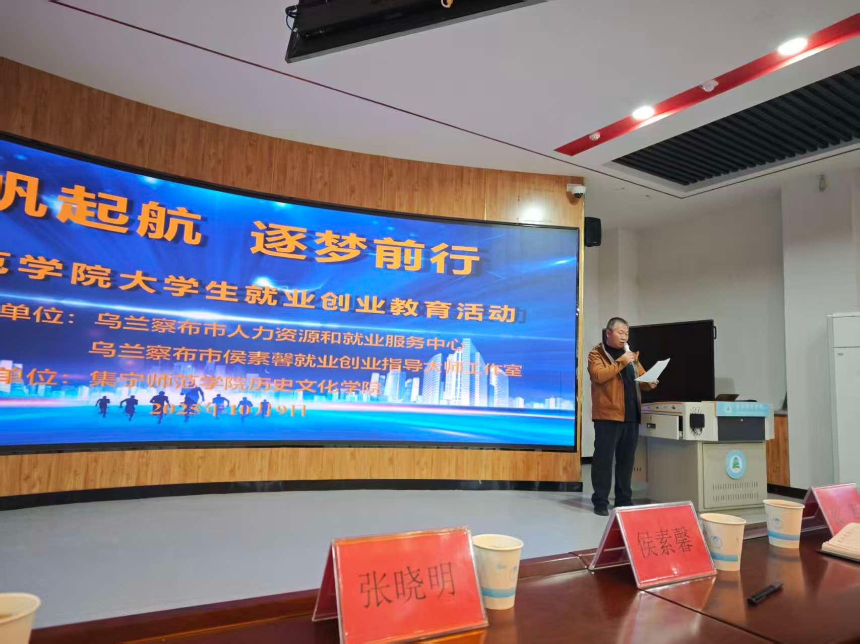 乌兰察布市人力资源和就业服务中心创业指导科科长张晓明、科员秦怡,乌兰察布市侯素馨就业创业指导大师工作室负责人、继续教育学院院长侯素馨,历史文化学院党总支书记赛汉其其格、党总支副书记、院长张军,以及历史文化学院、继续教育学院、大学生创业园相关人员参加了活动。