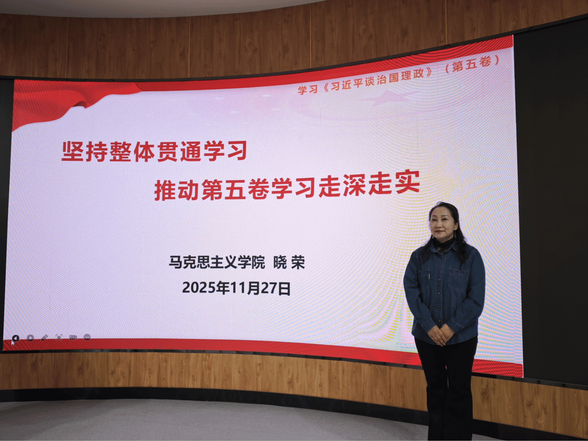 讲座中,晓荣老师紧扣《习近平谈治国理政》第五卷的核心要义,从时代背景、理论创新、实践要求三个维度展开解读。她系统梳理了著作收录的91篇重要文献脉络,深入阐释了“两个结合”的丰富内涵,重点解读了中国式现代化、高质量发展、党的自我革命等重大命题的理论逻辑与实践路径。晓荣老师结合鲜活案例,将抽象理论与基层实践相结合,既解读了“以人民为中心”的发展思想,又阐释了统筹发展与安全的战略考量,让听众深刻领会到习近平新时代中国特色社会主义思想的真理力量和实践伟力。