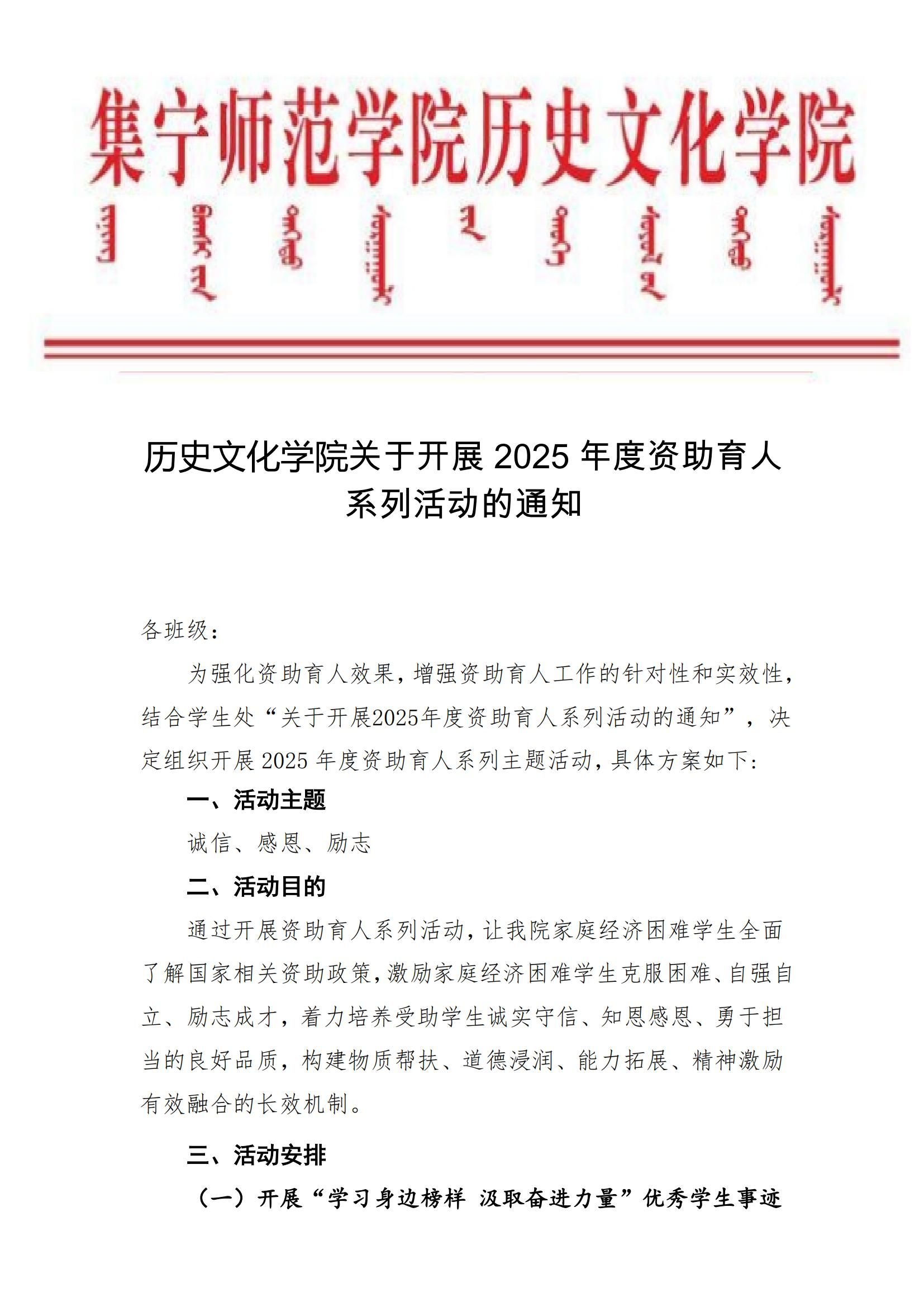 历史文化学院关于开展2025年度资助育人系列活动的通知