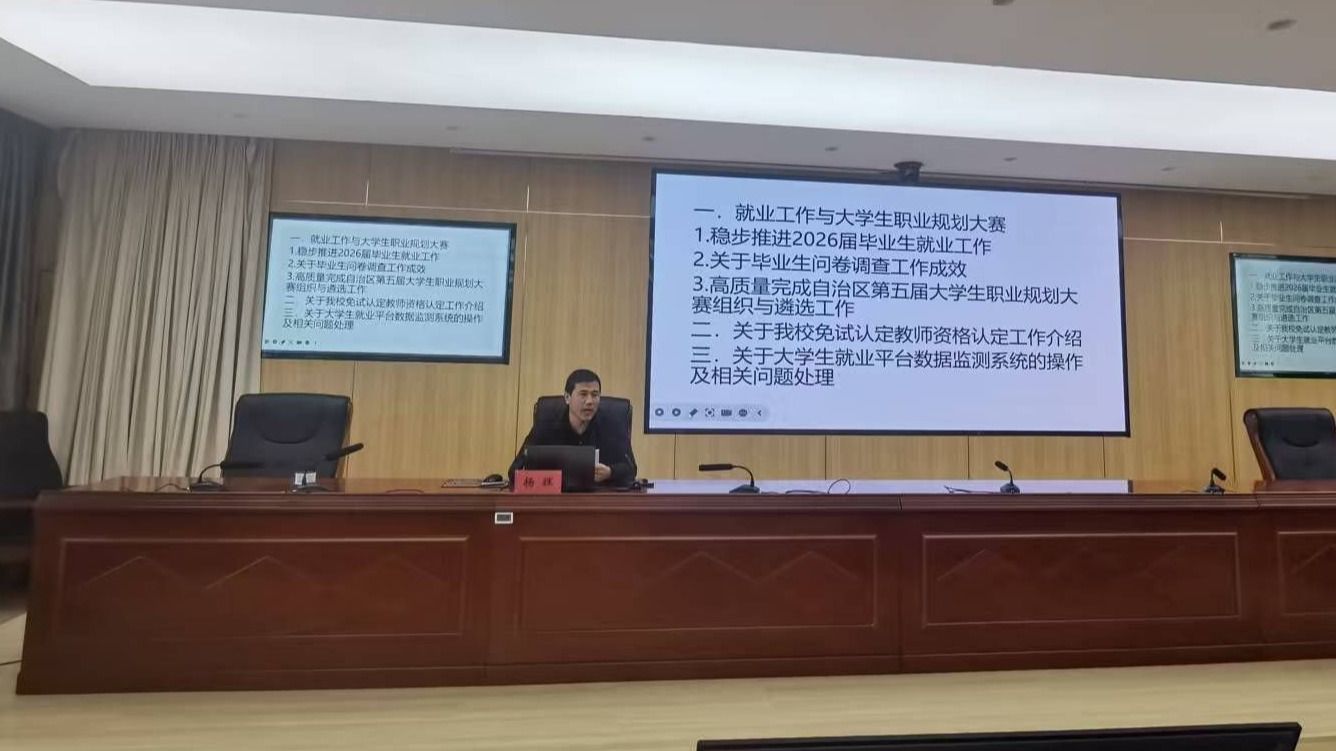 讲座重点围绕“就业工作与大学生职业规划大赛”进行了系统阐述。首先,招生就业处副处长杨辉强调,要稳步推进2026届毕业生就业工作,早谋划、早部署、早行动,通过建立健全工作机制,为毕业生顺利就业奠定坚实基础。其次,会议介绍了近期开展的毕业生问卷调查工作成效,通过数据分析精准把握毕业生的就业意向与需求,为后续精准施策、优化服务提供了重要参考。此外,会议还就高质量完成自治区第五届大学生职业规划大赛的组织与遴选工作进行了动员与部署,鼓励广大学生积极参与,以赛促学、以赛促就,明确职业方向,提升综合竞争力。